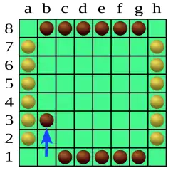 Noir commence par b1-b3. Le pion se déplace de deux cases car il y a deux pions sur la ligne : b1 et b8. Ce mouvement n'offre à Blanc aucune possibilité de capture. Au contraire, il limite les possibilités de Blanc en le coinçant sur la colonne A.