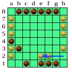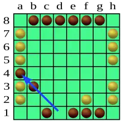 Un pion ne peut pas sauter par-dessus le pion adverse. Ainsi, dans le schéma ci-dessous, Blanc ne peut pas jouer a6-d6, bien qu'il y ait 3 pions dans la 6e rangée. Par contre, Blanc peut jouer a6-c4, se déplaçant de deux cases car il y a deux pions sur la diagonale (a6-f1) le long de laquelle Blanc se déplace.