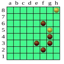 Sur la figure ci-dessous, c'est à Noir de jouer. Blanc menace de gagner en deux tours :