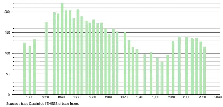 L'évolution du nombre d'habitants est connue à travers les recensements de la population effectués dans la commune depuis 1793. Pour les communes de moins de 10 000 habitants, une enquête de recensement portant sur toute la population est réalisée tous les cinq ans, les populations de référence des années intermédiaires étant quant à elles estimées par interpolation ou extrapolation[21]. Pour la commune, le premier recensement exhaustif entrant dans le cadre du nouveau dispositif a été réalisé en 2007[22].