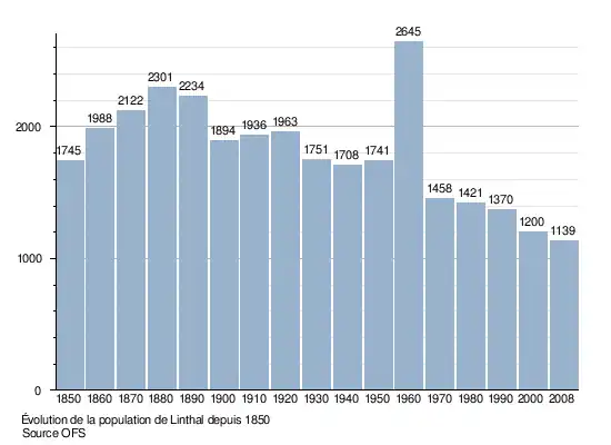 Le graphique suivant résume l'évolution de la population de Linthal entre 1850 et 2008[3] :
