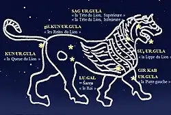 Plus tard, quand le ciel est organisé en constellations, ce qui se mesure au fait que les étoiles proches sont affectées d'un nom correspondant à leur situation dans une figure projetée sur la voûte céleste, soit dans la première moitié du 1er millénaire av. è. c., la plupart des étoiles du Lion possèdent une dénomination, depuis SU6, « la Lippe », jusqu’à KUN, « la Queue »[1]. Certains textes placent cette figure sous l’égide d’un dieu mineur, Lātarāk, personnage à tête de lion, mais il est bien possible que nous ayons là, au moins dans certaines cités, un emblème de la déesse Ištar.