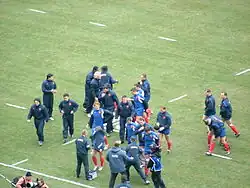 En , le XV de France entame le Tournoi des six nations 2009 par une défaite contre l'Irlande 30-21 à Dublin[33]. Les Bleus effacent ce revers face à l'Écosse et le pays de Galles, et gagnent respectivement 22-13[34] et 21-16[35]. Deux semaines plus tard, les Français sont dominés par l'Angleterre au stade de Twickenham 34-10[36]. La France remporte son dernier match contre l'Italie 50-8[37] et termine troisième derrière l'Angleterre et l'Irlande qui décroche le Grand chelem[38].