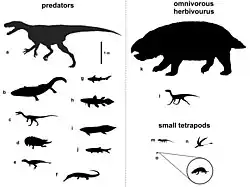 - 1 2 G. Niedźwiedzki, P. Gorzelak et T. Sulej, « Bite traces on dicynodont bones and the early evolution of large terrestrial predators », Lethaia, vol. 44, no 1, , p. 87–92 (DOI 10.1111/j.1502-3931.2010.00227.x)
