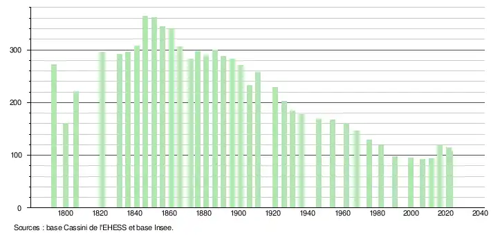 L'évolution du nombre d'habitants est connue à travers les recensements de la population effectués dans la commune depuis 1793. Pour les communes de moins de 10 000 habitants, une enquête de recensement portant sur toute la population est réalisée tous les cinq ans, les populations de référence des années intermédiaires étant quant à elles estimées par interpolation ou extrapolation[26]. Pour la commune, le premier recensement exhaustif entrant dans le cadre du nouveau dispositif a été réalisé en 2006[27].