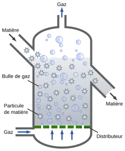 - il permet des catalyses hétérogènes plus efficaces, on parle de « réacteur à lit fluidifié », ou FBR (de l'anglais : fluidized bed reactor) ;