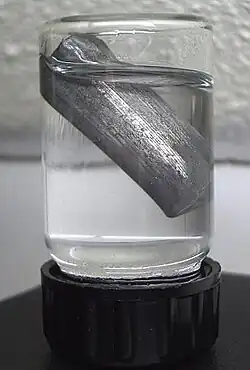 Pur, le lithium est un métal mou et gris argenté et le plus léger des éléments solides. Il s'oxyde rapidement au contact de l'air et de l'eau, devenant gris foncé, puis rapidement anthracite, puis noir. Comme les autres métaux alcalins, il est conservé dans de l'huile minérale pour le préserver de l'air.