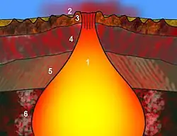 Le magma est injecté dans le centre d'expansion. Il se compose principalement d'une bouillie cristalline partiellement solidifiée dérivée d'injections antérieures, formant des lentilles de magma, qui sont la source de systèmes de dykes d'intrusion magmatique en plaques dans la croûte existante, et qui alimentent les Pillow lava en surface quand ils émergent. Lorsque ces laves se refroidissent, elles sont, dans la plupart des cas, modifiées chimiquement par l'eau de mer, qui hydrate la croûte (les ions OH sont incorporés dans les minéraux).