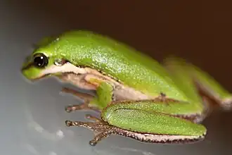 Cette grenouille arboricole est de couleur variable (selon la température et la couleur du milieu environnant), de beige à vert clair sur le dessus, avec parfois de petites taches noires sur le dos. Une ligne blanche débute sous les yeux et rejoint le ventre blanc. Une ligne brune commence au niveau de la narine et se continue jusqu'à l'œil puis entre le vert (ou beige) et blanc du haut et du bas du corps. Cette espèce possède des ventouses au niveau des doigts qui ne sont que légèrement plus grandes que les doigts et les doigts sont palmés aux trois quarts. Certains individus ont la partie postérieure de la cuisse orange.