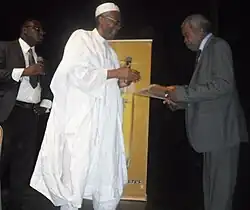 Guillaume Oyônô Mbia, Lauréat du Grand Prix des mécènes, reçoit son parchemin des mains du Dr Adamou Ndam Njoya, Président du Jury des GPAL 2014.