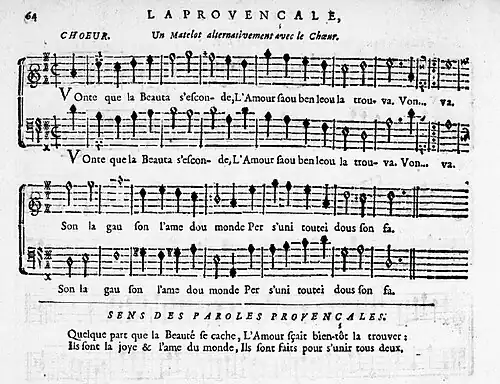 Le compositeur provençal Jean-Joseph Mouret inclut dans son opéra ballet Les Festes de Thalie des arias en provençal sur un livret de Joseph de La Font.