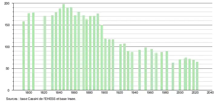 L'évolution du nombre d'habitants est connue à travers les recensements de la population effectués dans la commune depuis 1793. Pour les communes de moins de 10 000 habitants, une enquête de recensement portant sur toute la population est réalisée tous les cinq ans, les populations de référence des années intermédiaires étant quant à elles estimées par interpolation ou extrapolation[21]. Pour la commune, le premier recensement exhaustif entrant dans le cadre du nouveau dispositif a été réalisé en 2007[22].
