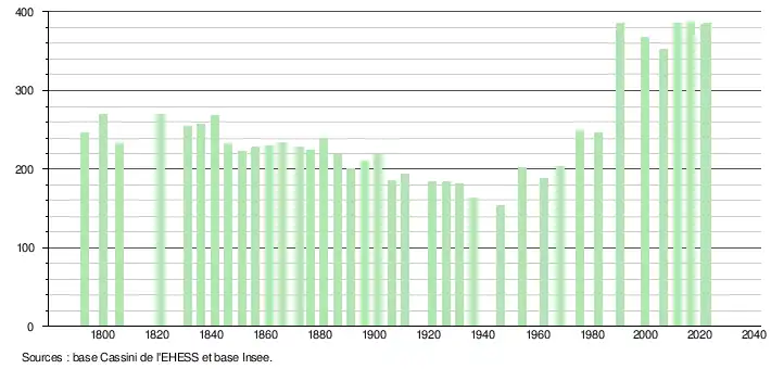 L'évolution du nombre d'habitants est connue à travers les recensements de la population effectués dans la commune depuis 1793. Pour les communes de moins de 10 000 habitants, une enquête de recensement portant sur toute la population est réalisée tous les cinq ans, les populations de référence des années intermédiaires étant quant à elles estimées par interpolation ou extrapolation[20]. Pour la commune, le premier recensement exhaustif entrant dans le cadre du nouveau dispositif a été réalisé en 2006[21].