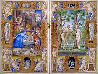 La double page qui présente au recto la Chute avec le fruit défendu et au verso l'Adoration des bergers illustre le thème de l'Incarnation, la Vierge Marie étant la nouvelle Ève qui, par la Nativité du Christ (précédée de son Fiat), répare le péché originel. Les Pères de l'Église ont relevé le fait qu'Ève (EVA en latin) s'écrit à l'inverse de l'AVE de la salutation mariale prononcée par l'archange Gabriel. Les deux illustrations sont bordées de structures architectoniques ponctuées de putti, de nus et d'atlantes.