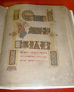 La décoration des premiers mots de chaque Évangile est extrêmement travaillée. Les pages concernées, de fait, ont pris l'apparence de tapisseries : les illustrations sont si élaborées que le texte en devient illisible. La page d'ouverture de l'Évangile selon Matthieu (voir ci-dessus le folio 29r), à ce titre, peut servir d'exemple : elle ne compte que les deux seuls mots « Liber generationis » (« le livre de la génération »). Le lib de Liber s'est développé en un monogramme géant dominant toute la page. Le er de Liber est représenté dans un entrelacement d'ornements avec le b du monogramme lib. Quant à Generationis, il s'étale sur trois lignes différentes et s'insère dans un cadre sophistiqué en bas à droite de la page. Le tout est regroupé par une bordure soignée[45].