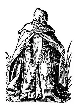 Un « livre de ceinture » (ou « livre en aumônière[N 1] » ; (en) Girdle book ; (de) Beutelbuch) est un petit livre portable adopté par les moines, les membres du clergé ou de l'aristocratie européens du Moyen Âge, qui fut un accessoire populaire de l'habit médiéval entre les XIIIe et XVIe siècles[2]. Il consiste en un livre dont la reliure de cuir, rappelant l'aumônière médiévale, pend sous la couverture du livre en une longue langue effilée avec un nœud au bout qui pouvait être glissé dans la gaine ou la ceinture de quelqu'un. Le nœud était en général fait de bandes de cuir tissées ensemble pour plus de durabilité. Le livre pendait à l'envers et en arrière afin de pouvoir le ramener à soi dans le bon sens pour le lire. Le livre était le plus souvent de thème religieux : l'office journalier d'un clerc (bréviaire) ou, pour les laïcs et en particulier pour les femmes, un livre d'heures. L'un des textes les plus répandus parmi les livres de ceintures est la Consolation de Philosophie de Boèce, bien qu'il ne s'agisse en fait que du seul livre de ceinture de philosophie ou de théologie qui nous soit parvenu. Les femmes portaient surtout des livres de ceintures par convenance car, au-dessus de la ceinture, ils étaient à la mode au XVe siècle[3]. Un livre sécurisé dans une ceinture permettait deux fonctions : permettre de le porter tout en ayant les mains libres et le protéger contre les éléments extérieurs. C'était aussi un signe extérieur de bonne position sociale et d'éducation (être un « lettré », savoir lire et écrire)[4]. Dans l'iconographie, les figures d'autorité, les saints (comme saint Jérôme) ou les apôtres, sont souvent représentés portant un livre de ceinture[5].