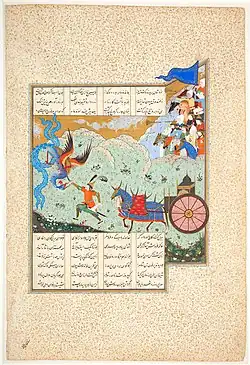 Le texte du Livre des Rois a bien entendu donné lieu à de nombreuses représentations, dans la peinture persane comme dans les objets (céramique, etc.).