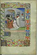 La dernière miniature, beaucoup plus tardive car remontant à 1470 environ, est ajoutée par Évrard d'Espinques, peintre de Jacques d'Armagnac (f.42v)[1].
