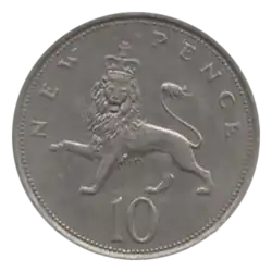 Avers et revers d'une pièce de dix New Pence émise peu après la décimalisation (1975). | ||