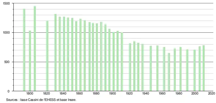 L'évolution du nombre d'habitants est connue à travers les recensements de la population effectués dans la commune depuis 1793. À partir du , les populations légales des communes sont publiées annuellement dans le cadre d'un recensement qui repose désormais sur une collecte d'information annuelle, concernant successivement tous les territoires communaux au cours d'une période de cinq ans. Pour les communes de moins de 10 000 habitants, une enquête de recensement portant sur toute la population est réalisée tous les cinq ans, les populations légales des années intermédiaires étant quant à elles estimées par interpolation ou extrapolation[12]. Pour la commune, le premier recensement exhaustif entrant dans le cadre du nouveau dispositif a été réalisé en 2005[13],[Note 2].