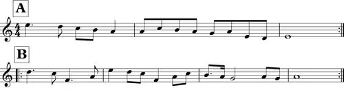 L'enregistrement original comportait un motif en la de trois mesures et un motif en si de quatre mesures, ici transposés dans la tonalité de la mineur :