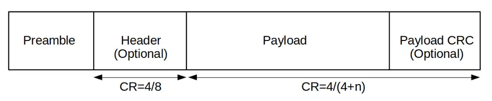 - L'en-tête est présent dans le mode de transmission par défaut (explicite), il est transmis avec un taux de code de 4/8. Il indique la taille des données, le taux de code pour le reste de la trame et il précise également si un CRC est présent. Un CRC est présent dans l'en-tête afin de permettre au récepteur de détecter s'il est altéré[14].