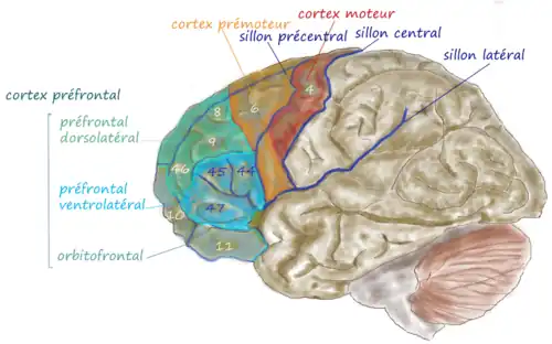 - le cortex préfrontal qui regroupe toutes les autres régions du lobe frontal. La forme et la position des gyrus et sillons du cortex préfrontal n'ont que peu de rapport avec leur structure architectonique.