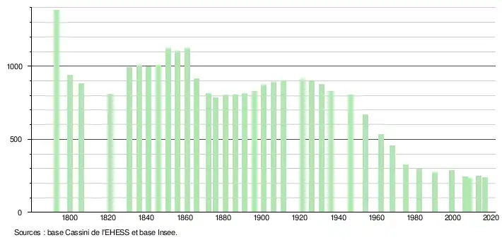 L'évolution du nombre d'habitants est connue à travers les recensements de la population effectués dans la commune depuis 1793. Pour les communes de moins de 10 000 habitants, une enquête de recensement portant sur toute la population est réalisée tous les cinq ans, les populations de référence des années intermédiaires étant quant à elles estimées par interpolation ou extrapolation[48]. Pour la commune, le premier recensement exhaustif entrant dans le cadre du nouveau dispositif a été réalisé en 2008[49].