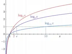 Le logarithme de base du nombre se note logb x. Si la base est évidente d'après le contexte, ou si elle n'a pas d'importance, on peut écrire simplement log x. Par définition, .