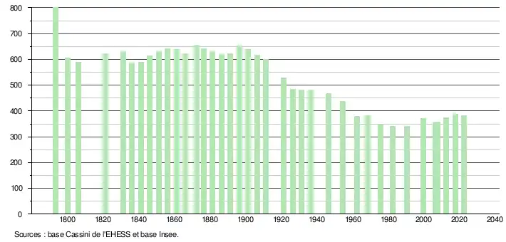 L'évolution du nombre d'habitants est connue à travers les recensements de la population effectués dans la commune depuis 1793. Pour les communes de moins de 10 000 habitants, une enquête de recensement portant sur toute la population est réalisée tous les cinq ans, les populations de référence des années intermédiaires étant quant à elles estimées par interpolation ou extrapolation[15]. Pour la commune, le premier recensement exhaustif entrant dans le cadre du nouveau dispositif a été réalisé en 2007[16].