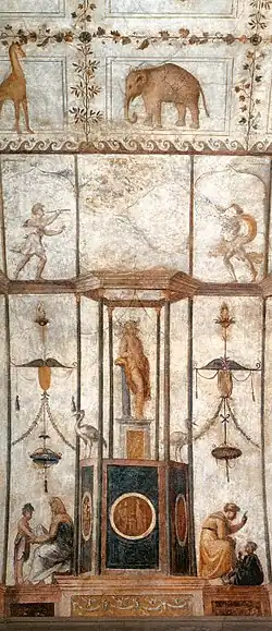 Devant les plus petites ouvertures, entre de fausses colonnes qui simulent la tenue d'un plafond à caissons, se trouvent quatre niches avec les Saisons : l'une d'elles est perdue à cause du percement d'une porte. Au-dessus, parmi les colonnes, se trouvent d'autres figures isolées ou groupées[2].