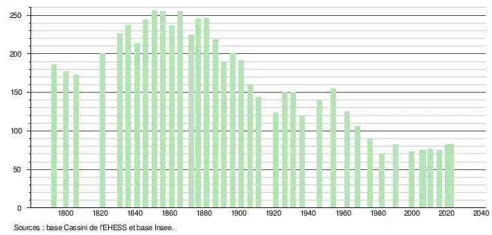 L'évolution du nombre d'habitants est connue à travers les recensements de la population effectués dans la commune depuis 1793. Pour les communes de moins de 10 000 habitants, une enquête de recensement portant sur toute la population est réalisée tous les cinq ans, les populations de référence des années intermédiaires étant quant à elles estimées par interpolation ou extrapolation[29]. Pour la commune, le premier recensement exhaustif entrant dans le cadre du nouveau dispositif a été réalisé en 2005[30].