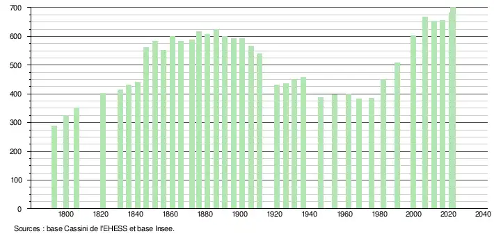 L'évolution du nombre d'habitants est connue à travers les recensements de la population effectués dans la commune depuis 1793. Pour les communes de moins de 10 000 habitants, une enquête de recensement portant sur toute la population est réalisée tous les cinq ans, les populations de référence des années intermédiaires étant quant à elles estimées par interpolation ou extrapolation[32]. Pour la commune, le premier recensement exhaustif entrant dans le cadre du nouveau dispositif a été réalisé en 2006[33].