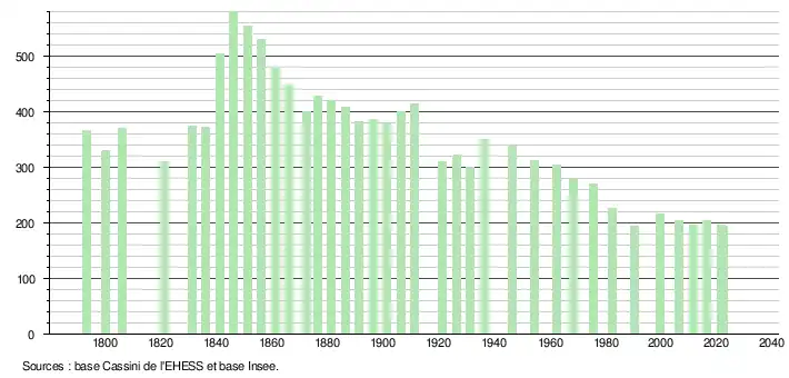 L'évolution du nombre d'habitants est connue à travers les recensements de la population effectués dans la commune depuis 1793. Pour les communes de moins de 10 000 habitants, une enquête de recensement portant sur toute la population est réalisée tous les cinq ans, les populations de référence des années intermédiaires étant quant à elles estimées par interpolation ou extrapolation[49]. Pour la commune, le premier recensement exhaustif entrant dans le cadre du nouveau dispositif a été réalisé en 2006[50].