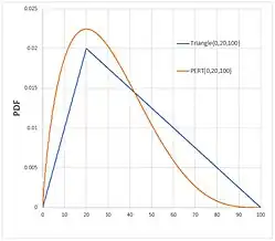 qui (contrairement à la loi bêta PERT) met autant l'accent sur les valeurs extrêmes qui sont généralement moins connues que la valeur la plus probable, et est donc moins fiable. La loi triangulaire a également une forme angulaire qui ne correspond pas à la forme plus lisse qui caractérise la connaissance subjective.