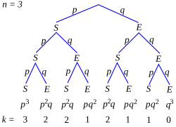 Le graphique est un arbre de probabilité pour une loi binomiale de paramètre n = 3. Sur chaque branche sont indiquées les probabilités des différentes issues : par exemple branches droite, gauche puis droite ; c'est-à-dire échec, succès puis échec. Au bout des branches de l'arbre, apparaissent les probabilités de chaque issue de la loi binomiale b(3, p). C'est-à-dire pour les valeurs k = 0, 1, 2 ou 3, on obtient , , et . On retrouve ainsi les différents coefficients binomiaux :