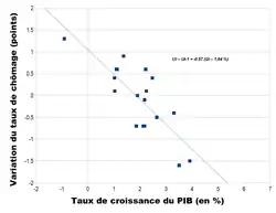 En outre, on peut constater que cette variation est fortement fonction des pays. En 1993, dans un article retentissant, cette relation a été mise en évidence par Martin Prachowny[11]. L'auteur, mettant en rapport la croissance du PIB sur les variations du taux de chômage, montre qu'une baisse de 3 % de la production augmente de 1 % le taux de chômage. L'ampleur de la baisse semble être en déclin au fil du temps aux États-Unis. Plus récemment, Andrew Abel et Ben Bernanke (2005), se fondant sur des estimations et des données récentes, montrent une baisse de 2 % de la production pour chaque point de pourcentage d'augmentation du taux de chômage[12].