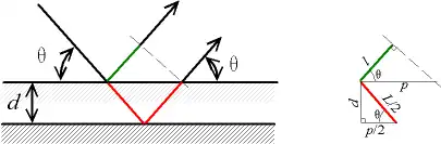 On peut retrouver la loi de Bragg de manière simple. Considérons deux rayons parallèles frappant deux atomes situés sur une même droite perpendiculaire à la surface du matériau. Le chemin supplémentaire parcouru par le rayon « profond » est , puisqu'il suit les côtés opposés à un angle de triangles rectangles d'hypoténuse . Les interférences sont constructives si la différence de chemin introduit un déphasage multiple de , c'est-à-dire si le chemin supplémentaire est un multiple de .