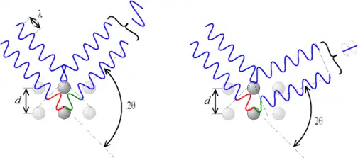 Pour cette loi, on considère des plans imaginaires contenant des atomes et perpendiculaires au vecteur de diffraction (c'est-à-dire à la bissectrice entre le faisceau incident et la direction à laquelle on s'intéresse). Mais il existe aussi d'autres lois décrivant la diffraction. Si est la longueur d'onde de la radiation et d est la distance inter-réticulaire du plan cristallin diffractant, alors les directions de l'espace dans lesquelles on aura des pics d'intensité (le pour étant la direction du faisceau incident) vérifient :