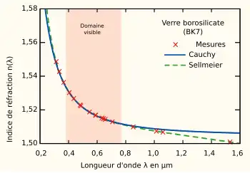 Encore très utilisée, de pair avec l'équation de Sellmeier dont elle est une simplification, la loi de Cauchy modélise d'une manière très précise l'indice de réfraction des matériaux dans le domaine du spectre visible[4].