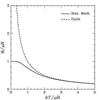 Cette loi peut être démontrée par la physique statistique en considérant un système composé d'un grand nombre de moments magnétiques indépendants pouvant s'orienter parallèlement ou antiparallèlement à un champ magnétique appliqué . On retrouve alors la loi de Curie dans la limite où l'énergie magnétique des particules reste très inférieure à l'énergie d'agitation thermique , où est la constante de Boltzmann.