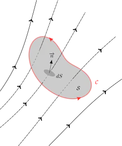 - Φ est le flux magnétique variable. Il est donc tel que : , avec S la surface délimitée par le contour C, et le vecteur unitaire normal à la surface élémentaire dS et orienté selon la règle du tire-bouchon de Maxwell.