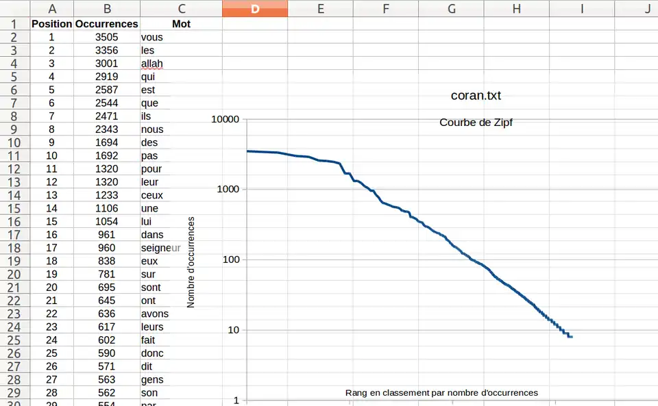 Toutefois ces résultats semblent un peu trop précis pour être parfaitement exacts : le dixième mot dans une étude de ce genre devrait apparaître environ 1 000 fois, en raison d'un effet de coude observé dans ce type de distribution. Il reste que la loi de Zipf prévoit que dans un texte donné, la fréquence d'occurrence d'un mot est liée à son rang n dans l'ordre des fréquences par une loi de la forme où est une constante.