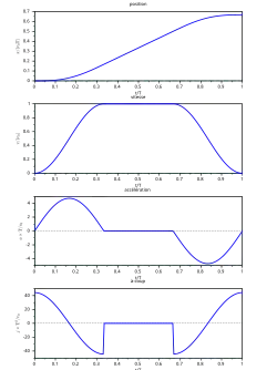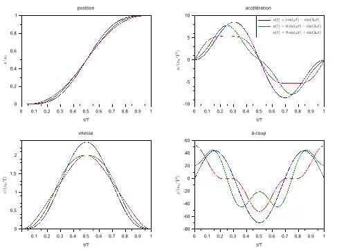 Le choix de la loi de mouvement est en général un compromis entre avoir une vitesse modérée, pour limiter les frottements et l'énergie dépensée, une accélération modérée, pour limiter les efforts des actionneurs et la puissance nécessaire, et un à-coup modéré, pour éviter les vibrations.