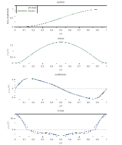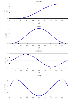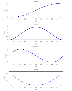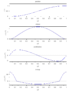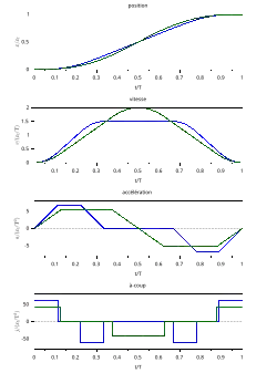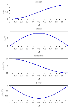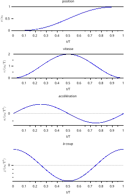 Les conditions initiales et finales imposent six conditions : x(0) = 0, v(0) = 0, a(0) = 0, x(T) = xf, v(T) = 0, a(T) = 0. La fonction x(T) est donc au minimum d'un polynôme de degré cinq :