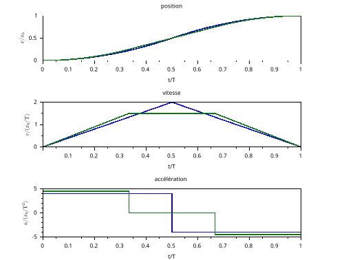 Supposons que l'on doit effectuer un mouvement rectiligne : la pièce en question doit se déplacer d'une abscisse x0 = 0 à une abscisse xf en une durée T, les vitesses initiales et finales étant nulles :