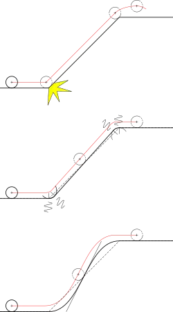 Une première solution consisterait à raccorder les segments de droite par des arcs de cercle dont le rayon est supérieur à celui du galet (figure du milieu). Si le système ne subit plus de choc, en revanche il subit des à-coups important en entrée et en sortie des raccordements circulaires. Par exemple à l'entrée du premier raccord, l'accélération verticale est nulle à gauche ; à droite, le galet est sur une trajectoire circulaire avec une vitesse circonférentielle vh, il subit donc une accélération radiale vh2/R. L'accélération passe donc instantanément de 0 à une valeur non-nulle. Autre manière de voir, c'est comme si le conducteur d'une voiture, pour aborder un virage, tournait brusquement le volant pour passer instantanément d'une trajectoire en ligne droite à un virage de rayon donné.