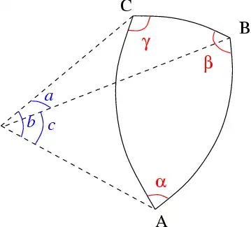 Dans un triangle sphérique ABC (Fig. 9), les dimensions réduites a, b et c correspondent à la mesure angulaire des segments de grand arc [BC], [AC] et [AB] et la loi des cosinus s'écrit[20] :