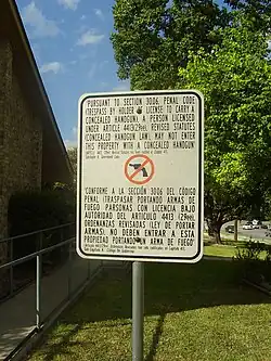 - Conformément à l'article 30.06, Code pénal (intrusion par le titulaire d'un permis avec une arme de poing dissimulée), une personne titulaire d'un permis en vertu du sous-chapitre H, chapitre 411, Code du gouvernement (loi sur les licences d'armes de poing), ne peut pas pénétrer dans cette propriété avec une arme de poing dissimulée[25].