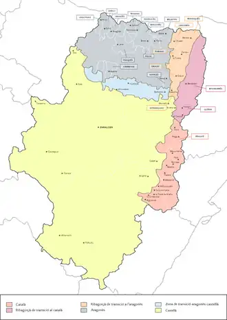 - une zone d'utilisation historique prédominante du catalan, à côté du castillan, dans l'est de l'Aragon (elle forme la moitié sud de la Frange d'Aragon le long de la frontière avec la Catalogne) ;